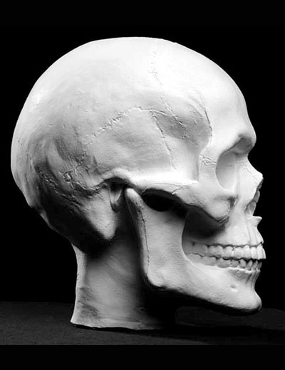 Life-size caucasian male skull cast in hydrocal has a sculpted base to maintain the proper position of the Frankfort line. Ideal for drawing and sculpting anatomical reference, in addition to facial reconstruction study.