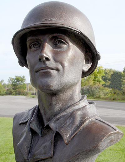 This bronze bust of a WWII soldier is from Philippe Faraut's series entitled Perpetual Battles. It is a portrait of John Wesley Scott killed during the Battle of Hürtgen Forest in November of 1944 but was sculpted to honor all those who fought during the war. Available in a limited edition in bronze the monument is part of a War Memorial in Honeoye, NY.