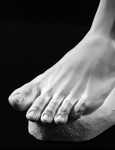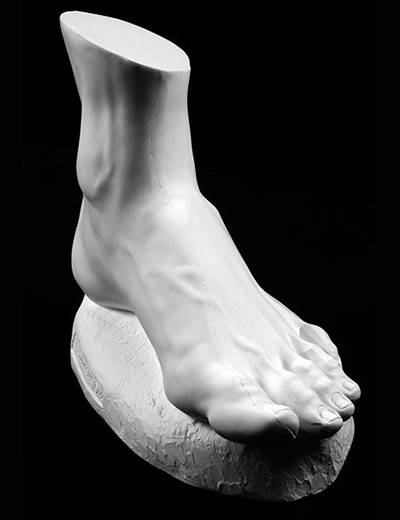 This life-size male foot cast in high quality plaster helps the artist visualize and understand the concept, as well as the importance, of developing the major planes of a three-dimensional model. Part of the foot is represented in planes and part is finished. Step-by-step instructions for modeling this anatomical reference model are shown in Faraut's book Figure Sculpting: Volume 1 and his DVD Techniques of Sculpture: Hands & Feet.