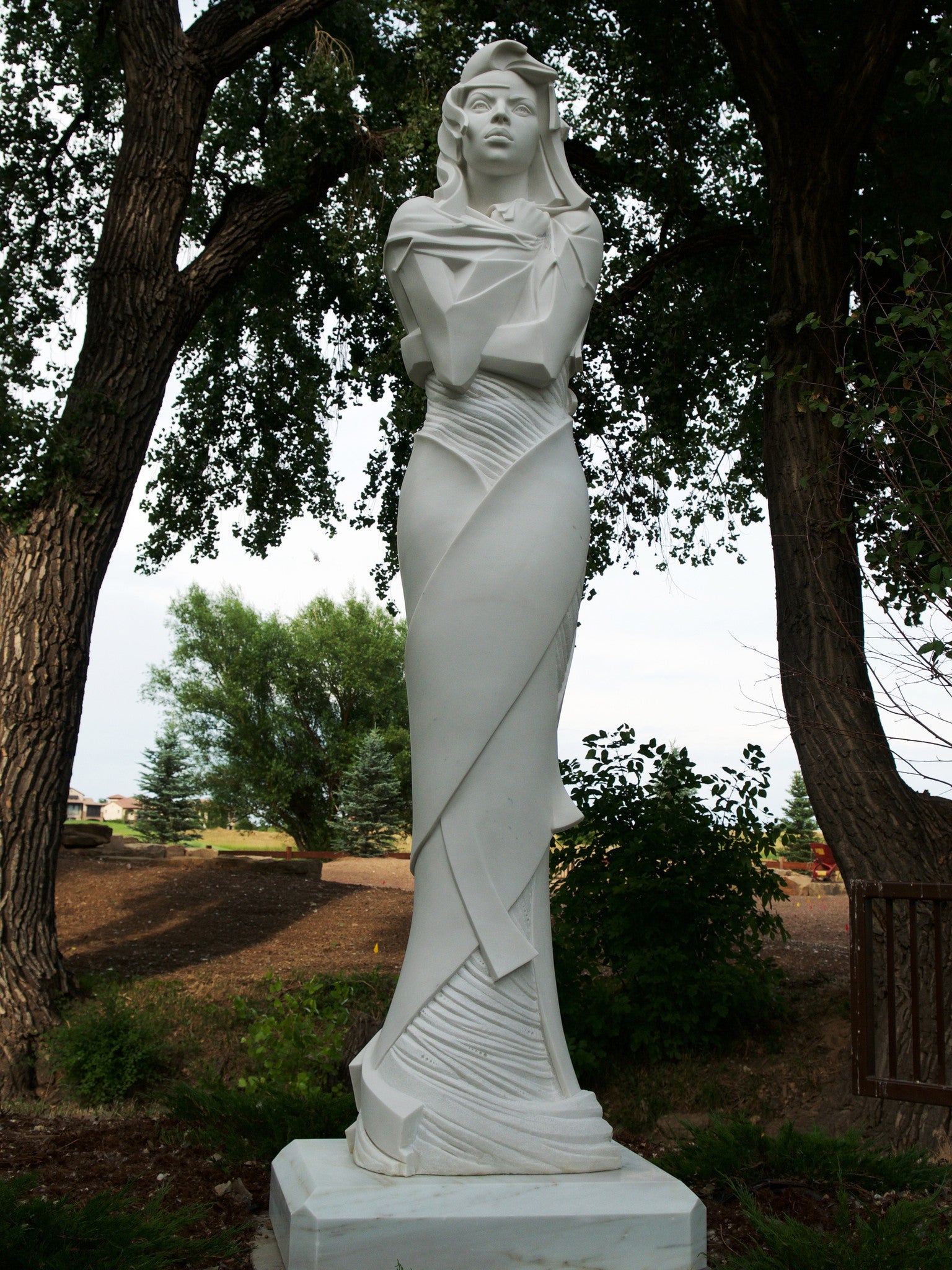 Air represents the inner strength of a woman. This white marble statue carved by Philippe Faraut is part of a private collection in Colorado. She is the sister piece to the black marble version entitled Polaris.